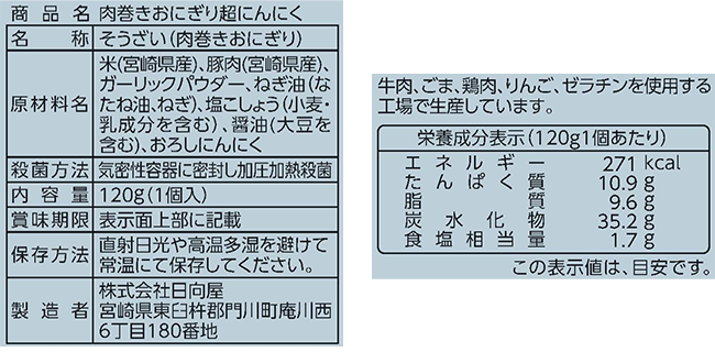 原材料名 米(宮崎県産)、豚肉(宮崎県産)、ガーリックパウダー、ねぎ油(なたね油、ねぎ)、塩こしょう(小麦・乳成分を含む)、醤油(大豆を含む)、おろしにんにく