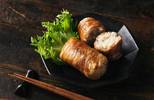 自家製の芳ばしいねぎ油で味付けしたおにぎりを、塩味の豚肉でひとつひとつ巻き上げ、オーブンで美味しく焼き上げました。