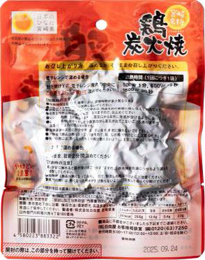 うまみ豊かな親鶏肉に味付けをし、鶏油が引火した強烈な炎で一気に焼き上げる本格炭火焼です。鶏肉はもちろん、塩やにんにくなどの副原材料もすべて国産品にこだわってつくりました。日向屋創業以来の、強い火力で焼き上げることで炭火焼の美味しさを最大限に引き出す製法に加え、原材料はすべて国産品を厳選した、まさにこだわりの一品です。おつまみ、おかずに最適です。