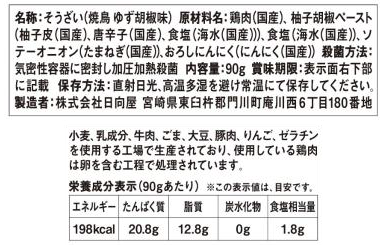 | 原材料名 | 鶏肉(国産)、柚子胡椒ペースト(柚子皮(国産)、唐辛子(国産)、食塩(海水(国産)))、食塩(海水(国産))、ソテーオニオン(たまねぎ(国産))、おろしにんにく(にんにく(国産)) |