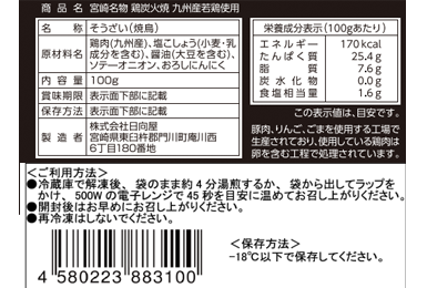 | 原材料名 | 鶏肉(九州産)、塩こしょう(小麦・乳成分を含む)、醤油(大豆を含む)、ソテーオニオン、おろしにんにく |